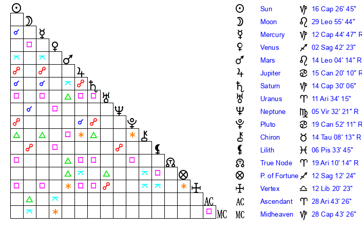 | Saturn | 14 Capricorn 45 | 15 Pisces 0 | 23 Capricorn 7 |