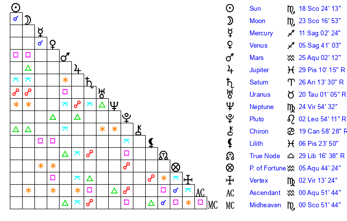 | Sun | 18 Scorpio 24 | 19 Scorpio 33 | 15 Aquarius 45 |