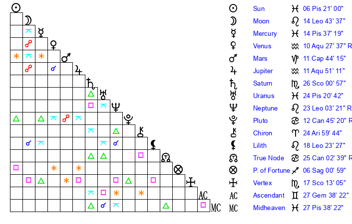 | Mercury | 14 Pisces 38 | 20 Pisces 38 | 13 Gemini 19 |