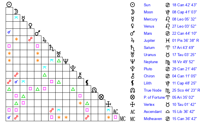| Sun | 18 Cancer 42 | 19 Cancer 38 | 12 Libra 46 |