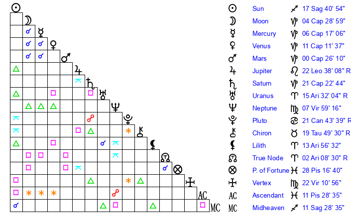 | Sun | 17 Sagittarius 41 | 19 Sagittarius 8 | 21 Pisces 55 |