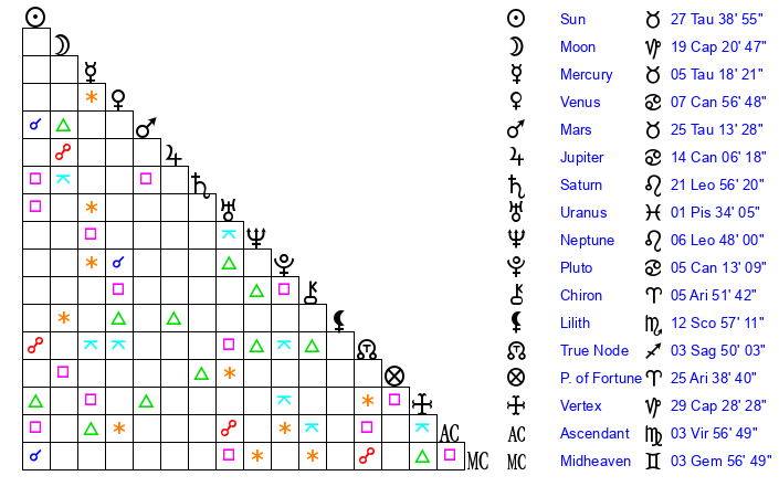 | Moon | 19 Capricorn 17 | 19 Aquarius 5 | 10 Sagittarius 23 |