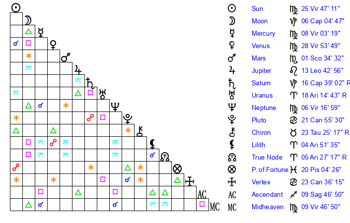 | Neptune | 6 Virgo 17 | 0 Aries 51 | 7 Virgo 57 |
