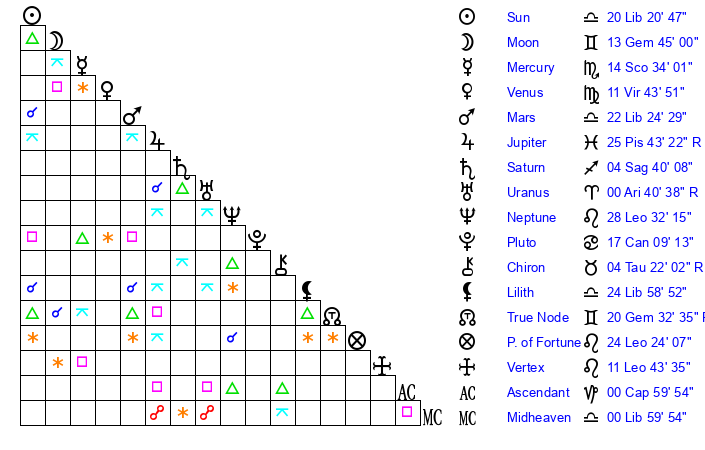 | Sun | 20 Libra 21 | 21 Libra 36 | 29 Capricorn 25 |