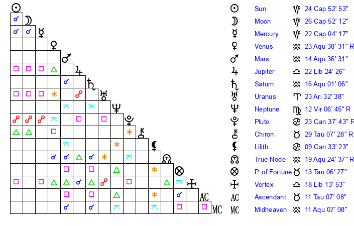 | Saturn | 16 Aquarius 11 | 15 Pisces 42 | 26 Aquarius 8 |