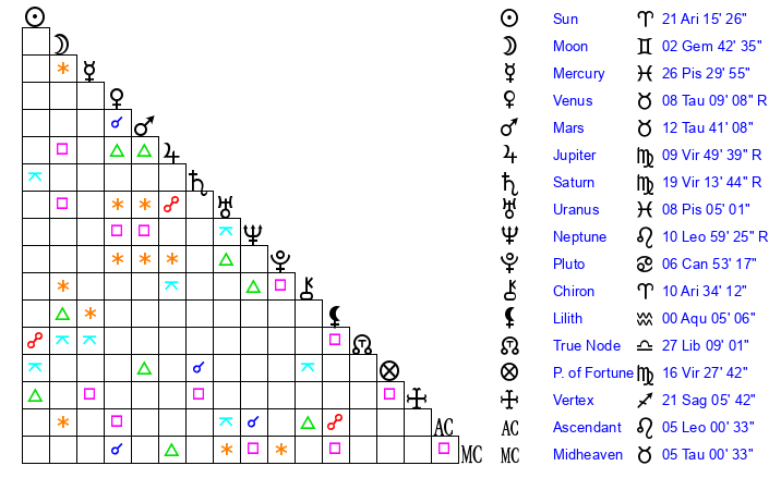 | Sun | 21 Aries 15 | 22 Aries 3 | 1 Leo 13 |