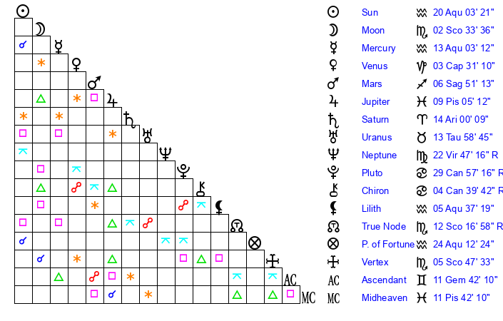 | Moon | 2 Scorpio 29 | 16 Cancer 46 | 22 Sagittarius 20 |