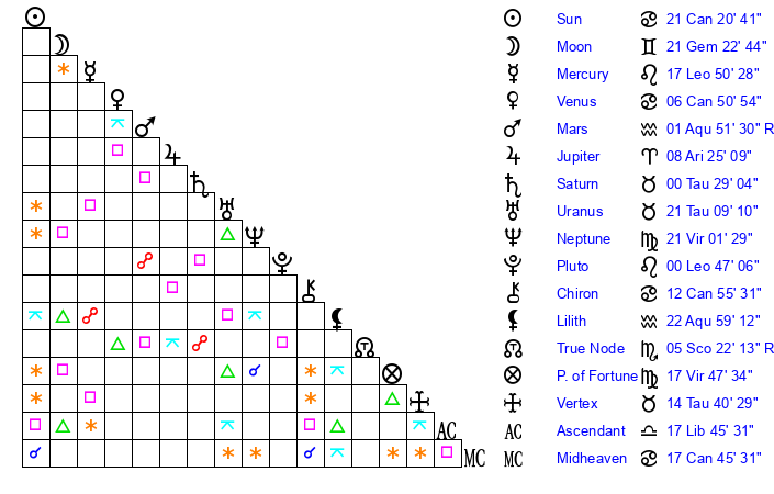 | Moon | 21 Gemini 20 | 9 Pisces 42 | 17 Leo 16 |