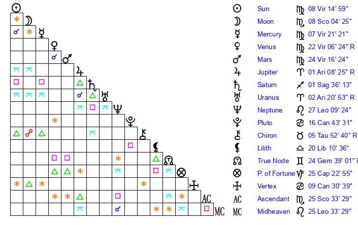 | Sun | 8 Virgo 15 | 9 Virgo 30 | 15 Sagittarius 37 |