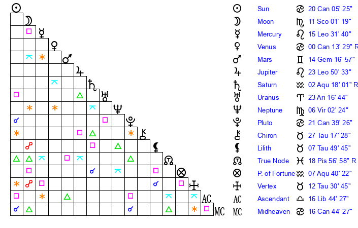 | Moon | 11 Scorpio 3 | 12 Aquarius 59 | 10 Aries 43 |