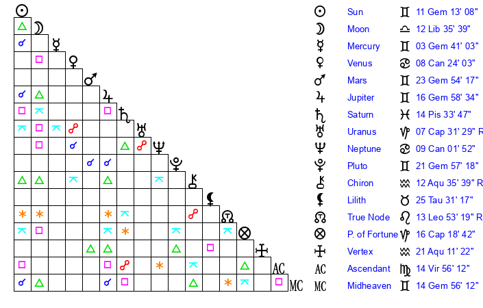 | Sun | 11 Gemini 13 | 12 Gemini 24 | 5 Libra 38 |