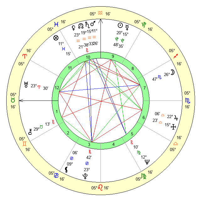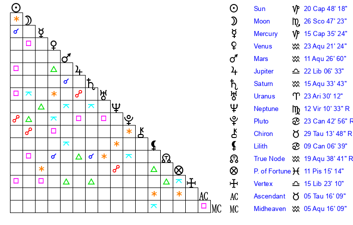 | Moon | 26 Scorpio 54 | 23 Gemini 27 | 5 Aries 52 |