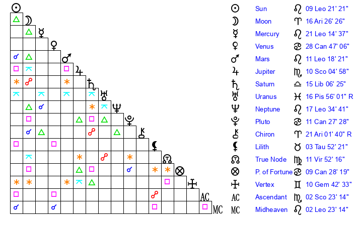 | Neptune | 17 Leo 34 | 1 Aries 57 | 20 Leo 21 |