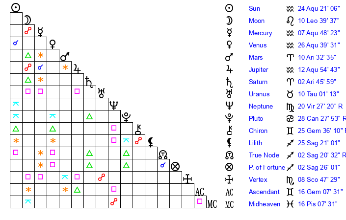 | Sun | 24 Aquarius 21 | 25 Aquarius 15 | 20 Taurus 20 |