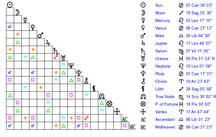 | Moon | 19 Sagittarius 34 | 2 Virgo 54 | 27 Libra 5 |
