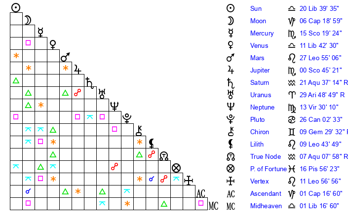 | Venus | 11 Libra 42 | 1 Libra 1 | 5 Aquarius 58 |