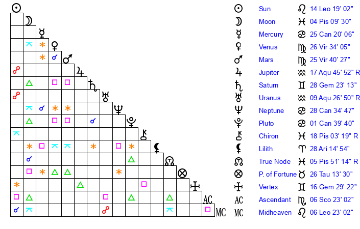 | Moon | 4 Pisces 4 | 25 Capricorn 29 | 27 Pisces 41 |