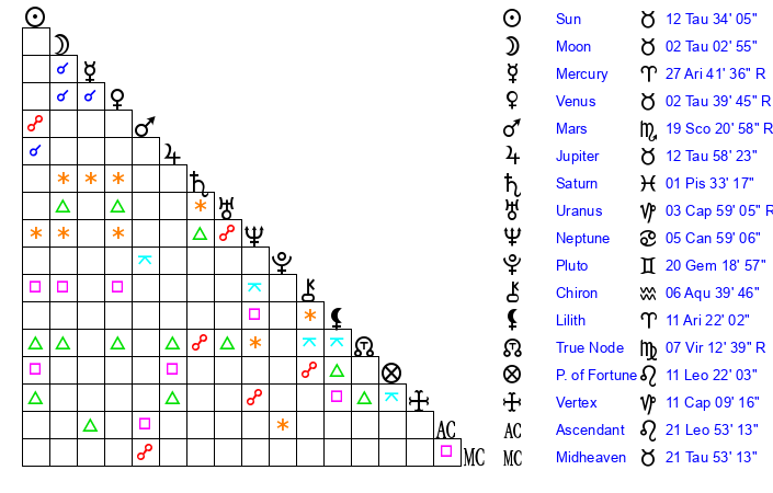 | Sun | 12 Taurus 34 | 13 Taurus 30 | 7 Virgo 35 |