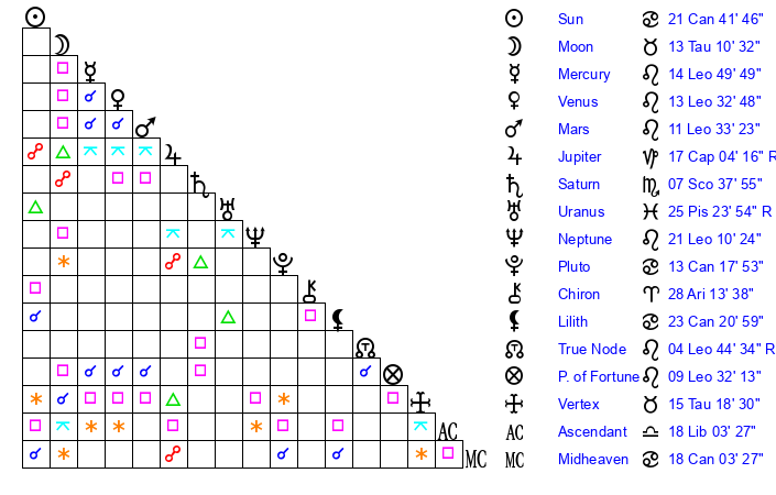 | Neptune | 21 Leo 10 | 2 Aries 8 | 24 Leo 26 |