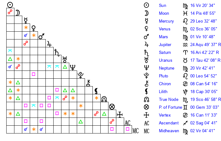 | Sun | 16 Virgo 20 | 17 Virgo 16 | 12 Sagittarius 54 |