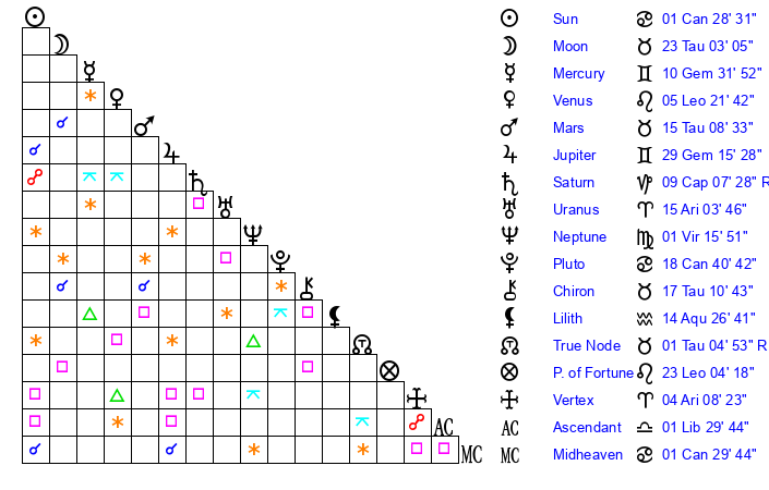 | Moon | 23 Taurus 0 | 8 Gemini 40 | 28 Scorpio 39 |