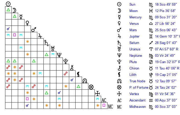 | Sun | 18 Scorpio 50 | 19 Scorpio 33 | 26 Aquarius 18 |