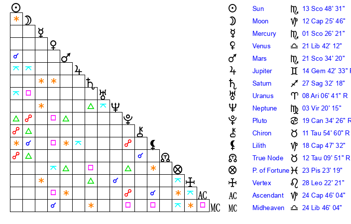 | Sun | 13 Scorpio 48 | 14 Scorpio 32 | 21 Aquarius 15 |