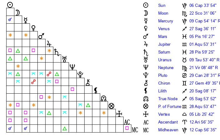 | Moon | 22 Scorpio 29 | 10 Sagittarius 59 | 22 Capricorn 17 |