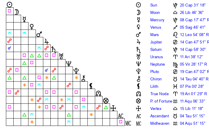 | Moon | 26 Libra 41 | 23 Gemini 27 | 29 Pisces 4 |