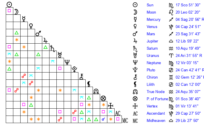 | Sun | 17 Scorpio 51 | 18 Scorpio 33 | 21 Aquarius 17 |