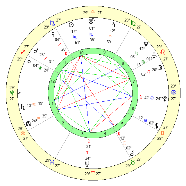 | Moon | 20 Leo 0 | 29 Cancer 33 | 5 Capricorn 27 |