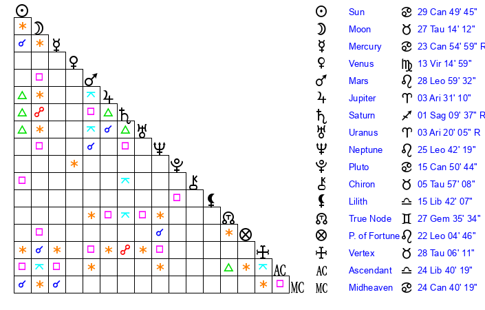 | Moon | 27 Taurus 8 | 16 Cancer 48 | 19 Sagittarius 42 |