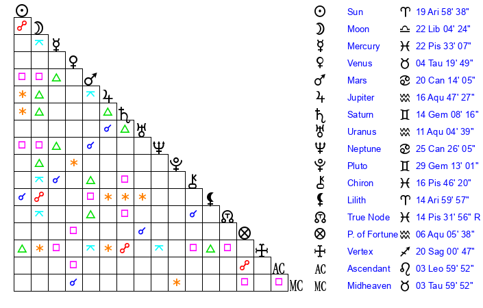 | Sun | 19 Aries 58 | 21 Aries 4 | 6 Leo 39 |