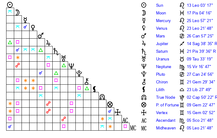 | Moon | 16 Pisces 59 | 29 Sagittarius 56 | 28 Gemini 2 |