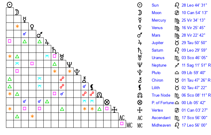 | Moon | 10 Cancer 48 | 9 Leo 47 | 2 Taurus 51 |
