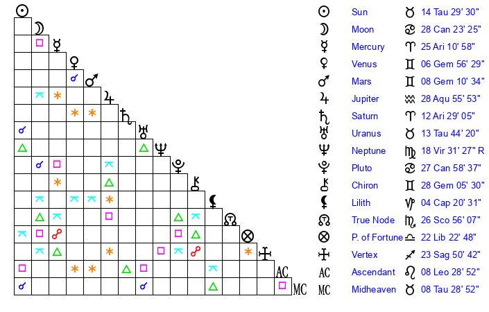 | Sun | 14 Taurus 29 | 15 Taurus 24 | 7 Leo 46 |