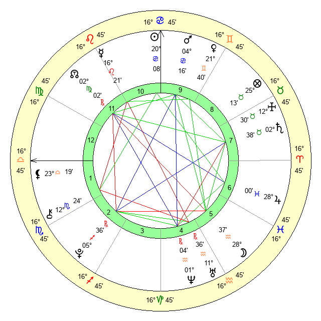 | Mars | 4 Cancer 16 | 14 Virgo 38 | 22 Cancer 9 |