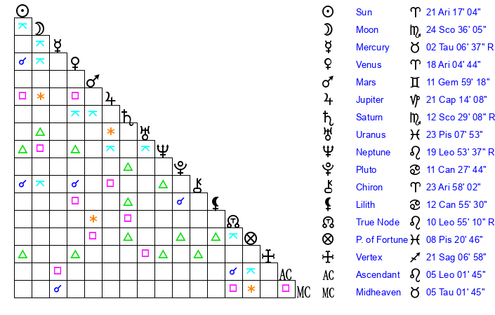 | Neptune | 19 Leo 53 | 0 Aries 27 | 21 Leo 22 |