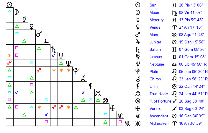 | Moon | 2 Virgo 42 | 28 Scorpio 12 | 2 Virgo 20 |