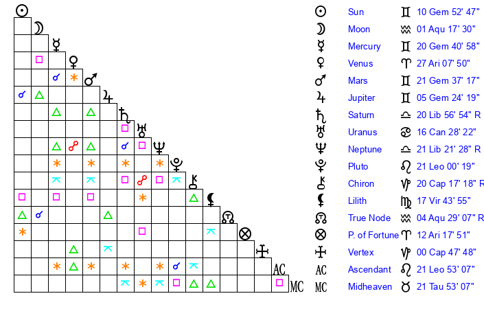 Sun | 10 Gemini 53 | 11 Gemini 27 | 19 Leo 40 |