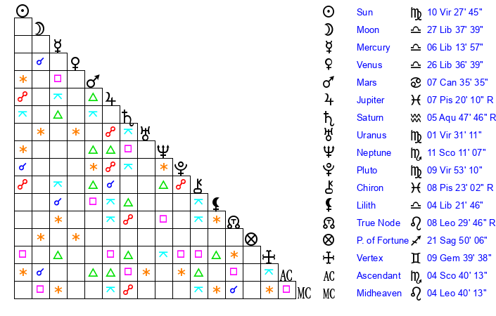 | Neptune | 11 Scorpio 10 | 1 Aries 17 | 13 Scorpio 11 |