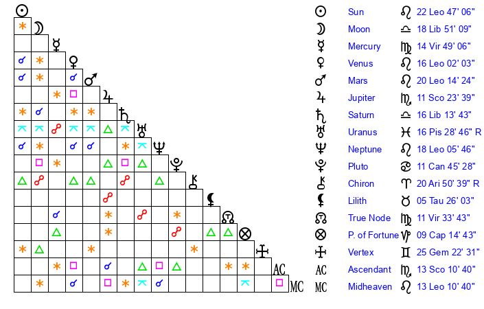 | Sun | 22 Leo 47 | 24 Leo 5 | 3 Sagittarius 25 |