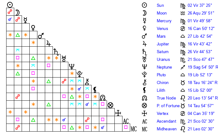 | Saturn | 27 Virgo 6 | 0 Aries 19 | 2 Libra 37 |