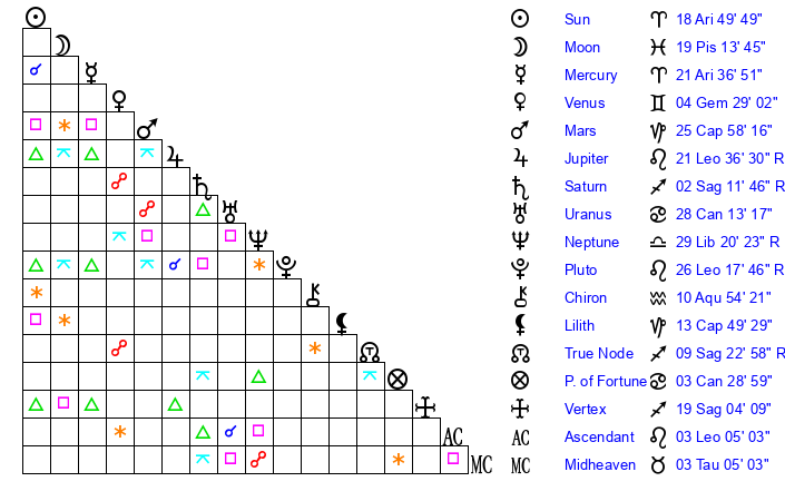 | Sun | 18 Aries 49 | 19 Aries 6 | 25 Gemini 29 |