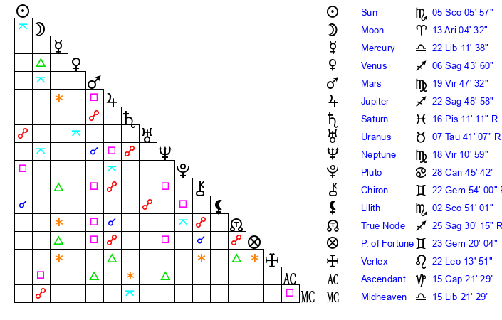 | Neptune | 18 Virgo 10 | 29 Pisces 51 | 18 Virgo 36 |
