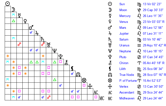 | Mercury | 26 Leo 11 | 8 Virgo 1 | 7 Sagittarius 6 |