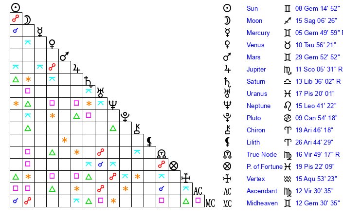 | Sun | 8 Gemini 15 | 9 Gemini 32 | 15 Virgo 58 |