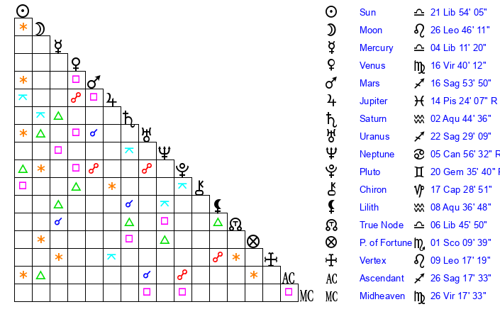 | Moon | 26 Leo 43 | 26 Leo 9 | 14 Aquarius 27 |