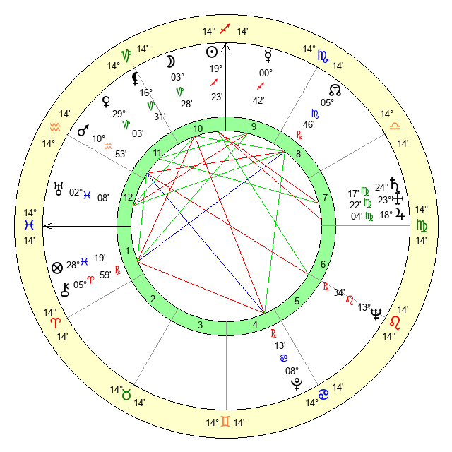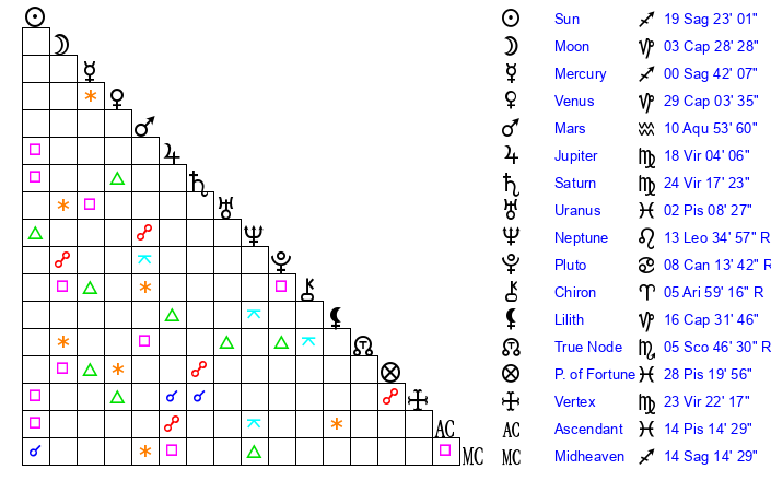 | Saturn | 24 Virgo 58 | 25 Pisces 13 | 21 Virgo 5 |