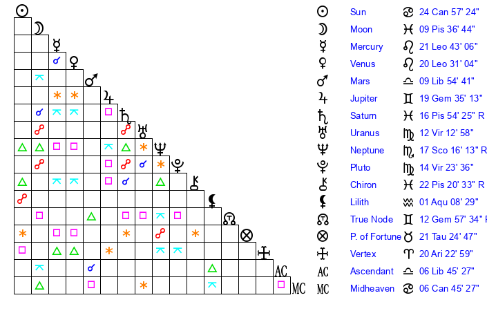 | Venus | 20 Leo 32 | 14 Gemini 41 | 2 Scorpio 19 |